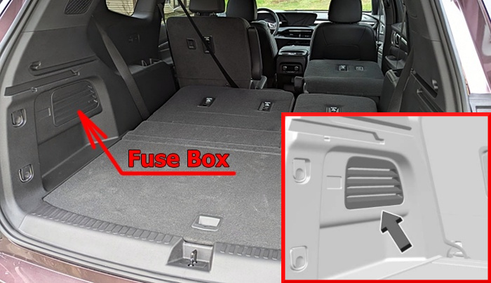The rear compartment fuse block is behind a trim panel on the driver side of the rear storage compartment. The panel is removed by prying along the top edge of the trim panel. Remove the trim panel to access the fuse block, or see your dealer.