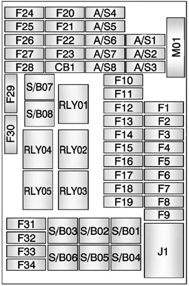 No. Type Description F1 Mini Fuse Sunroof F2 Mini Fuse Outside Rearview Mirror Switch F3 Mini Fuse Canister vent solenoid F4 Mini Fuse N/A F5 Mini Fuse Electronic brake control module valve F6 Mini Fuse 2013-2015: N/A2016: Intelligent battery sensorF7 Mini Fuse N/A F8 Mini Fuse Transmission control module battery F9 Mini Fuse 2013-2015: BCM Regulated Voltage Control2016: N/AF10 Mini Fuse Fuel System Control Module R/C / Headlamp Leveling F11 Mini Fuse Rear wiper F12 Mini Fuse Rear window defogger F13 Mini Fuse N/A F14 Mini Fuse Outside Rearview Mirror Heater F15 Mini Fuse Fuel system control module battery F16 Mini Fuse Heated seat module / Memory module F17 Mini Fuse Transmission Control Module R/C F18 Mini Fuse Engine Control Module R/C F19 Mini Fuse Fuel pump F20 Mini Fuse N/A F21 Mini Fuse Fan Relay (Auxiliary Fuse Block) F22 Mini Fuse N/A F23 Mini Fuse Ignition coil / Injector F24 Mini Fuse Washer pump F25 Mini Fuse N/A F26 Mini Fuse Canister Purge Solenoid / Water Valve Solenoid / Oxygen Sensors – Pre and Post / Turbo Wastegate Solenoid (1.4L) / Turbo Bypass Solenoid (1.4L) F27 Mini Fuse 2013-2015: N/A2016: Auxiliary Heater PumpF28 Mini Fuse 2013-2015: N/A2016: Engine Control Module Powertrain Ignition 1F29 Mini Fuse Engine Control Module Powertrain Ignition 2 F30 Mini Fuse Mass Air Flow Sensor F31 Mini Fuse Left high-beam headlamp F32 Mini Fuse Right high-beam headlamp F33 Mini Fuse Engine control module battery F34 Mini Fuse Horn F35 Mini Fuse Air Conditioning Compressor Clutch F36 Mini Fuse Front fog lamps J1 J-Case Fuse Electronic brake control module pump J2 J-Case Fuse Front wiper J3 J-Case Fuse Blower Motor J4 J-Case Fuse IEC RC J5 J-Case Fuse N/A J6 J-Case Fuse N/A J7 J-Case Fuse 2013-2015: N/A2016: Starter Solenoid (Automatic Transmission) / N/A (Manual Transmission)J8 J-Case Fuse Cooling Fan Low/Mid J9 J-Case Fuse Cooling Fan High J10 J-Case Fuse EVP J11 J-Case Fuse 2013-2015: Starter Solenoid2016: Pinion Starter Solenoid (Automatic Transmission) / Starter Solenoid (Manual Transmission)