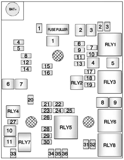 No. Type Description RLY2 U-Micro Relay 2013-2015: N/A2016: Fuel pumpRLY4 U-Micro Relay Starter / Spare RLY7 HC-Micro Relay Starter / Starter pinion RLY1 Mini Relay Run / Crank RLY3 Mini Relay Cooling fan – mid RLY5 Mini Relay Powertrain relay RLY8 Mini Relay Cooling fan – low RLY6 HC-Mini Relay Cooling fan – high