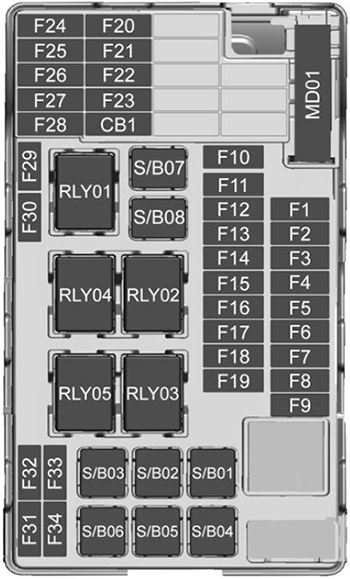 No. Type Description F1 Mini Fuse N/A F2 Mini Fuse N/A F3 Mini Fuse Amplifier audio F4 Mini Fuse N/A F5 Mini Fuse Rear drive control module F6 Mini Fuse Left cornering lamp F7 Mini Fuse Right cornering lamp F8 Mini Fuse N/A F9 Mini Fuse N/A F10 Mini Fuse N/A F11 Mini Fuse N/A F12 Mini Fuse N/A F13 Mini Fuse N/A F14 Mini Fuse N/A F15 Mini Fuse N/A F16 Mini Fuse N/A F17 Mini Fuse N/A F18 Mini Fuse N/A S/B1 S/B Fuse N/A S/B2 S/B Fuse N/A S/B3 S/B Fuse N/A S/B4 S/B Fuse DC/AC inverter module S/B5 S/B Fuse N/A S/B6 S/B Fuse N/A S/B7 S/B Fuse DC-DC transformer 400W S/B8 S/B Fuse DC-DC transformer 400W S/B9 S/B Fuse N/A