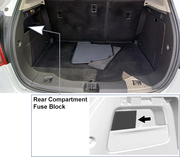 The rear compartment fuse block is behind a cover on the left side of the rear compartment. To access the fuses, remove the cover.