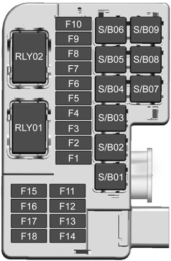 No. Type Description F1 Mini Fuse 2018-2021: Amplifier audio2022: N/AF2 Mini Fuse Rear drive control module F3 Mini Fuse N/A F4 Mini Fuse N/A F5 Mini Fuse N/A F6 Mini Fuse N/A F7 Mini Fuse N/A F8 Mini Fuse N/A F9 Mini Fuse N/A F10 Mini Fuse N/A F11 Mini Fuse N/A F12 Mini Fuse N/A F13 Mini Fuse N/A F14 Mini Fuse N/A F15 Mini Fuse N/A F16 Mini Fuse N/A F17 Mini Fuse N/A S/B1 S/B Fuse 2018-2020: DC-DC transformer 400W2021-2022: N/AS/B2 S/B Fuse 2018-2020: DC-DC transformer 400W2021-2022: N/AS/B3 S/B Fuse DC/AC inverter module S/B4 S/B Fuse N/A S/B5 S/B Fuse N/A