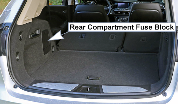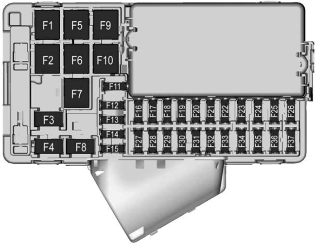 No. Description F1 — F2 Front HVAC blower F3 Power seat F4 Lighter (China only) F5 — F6 Front power windows F7 — F8 2016-2018: Accessory power outlet2019-2020: Mid accessory power outletF9 Body control module 8 F10 Rear power windows F11 — F12 Sunroof F13 Front heated seats F14 Outside rearview mirror F15 Body control module 3 F16 — F17 2016-2018: Body control module 62019-2020: Not UsedF18 Body control module 7 F19 Data link connector F20 SDM F21 HVAC F22 Liftgate release F23 Passive entry/ Passive start F24 OCC sensor F25 Steering wheel controls F26 2016-2018: Ignition2019-2020: Column lock assemblyF27 Body control module 4 F28 Transmission control module F29 Body control module 2 F30 USB F31 Rear HVAC blower F32 Body control module 1 F33 Universal remote system/garage door opener F34 Parking assist F35 OnStar F36 Display F37 Radio