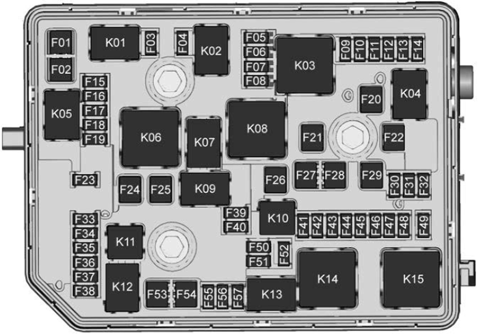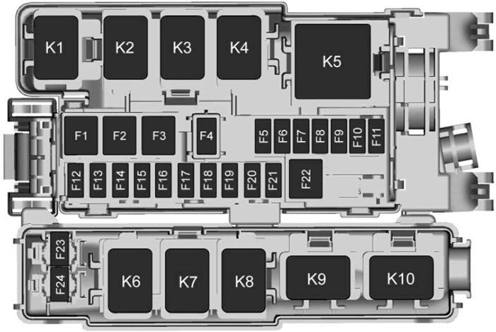 No. Description K1 Start/Stop K2 A/C clutch K3 Engine control module K4 Wiper K5 Start solenoid K6 — K7 — K8 Transmission oil pump K9 Wiper speed K10 Starter K11 Headlamp washers K12 High-beam headlamps K13 2016-2018: Daytime running lamps2019-2020: Low-beam headlampsK14 Run/Crank K15 Rear window/Mirror defogger