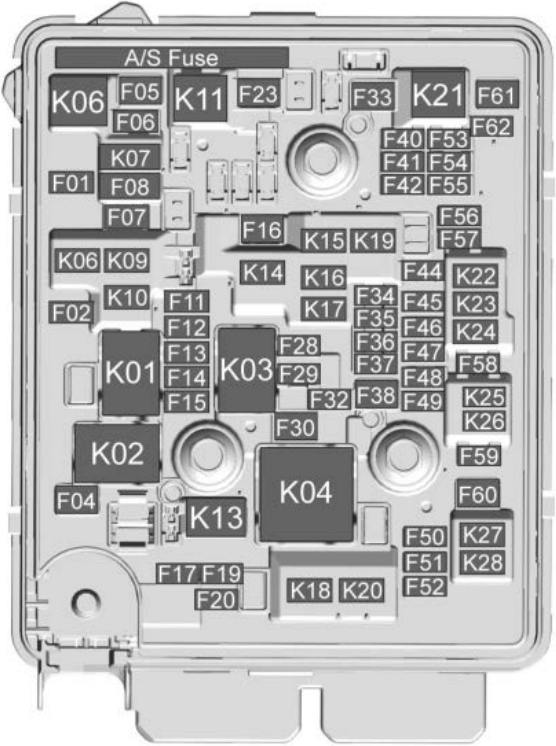 No. Description K01 STARTER SOL RELAY K02 – K03 POWERTRAIN RELAY K04 COOLING FAN HIGH RELAY