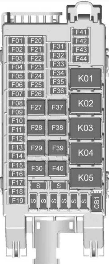 No. Usage F01 ONSTAR for NA market F02 Sunshade Motor F03 Body Control Module 3 F04 Body Control Module 7 F05 Body Control Module 6 F06 HVAC Module 1 F07 CCM – Central Gateway Module F08 HSWM – Heated Steering Wheel Module F09 Virtual Cockpit Display / Instrument Panel Display / HVAC Display F10 Radio / Virtual Cockpit Unit Module F11 ONSTAR for Non-NA market F12 Side Blind Zone Alert Module / Camera Module / Ultrasonic Park Assist Module F13 HVAC Module IGN F14 Wireless Charger Module / Remote Electronic PRNDL Display F15 BCM2 – Body Control Module 2 F16 BCM1 – Body Control Modulel F17 Steering Wheel Controls Backlighting F18 – F19 – F20 Steering Wheel Controls Switch F21 BCM5 – Body Control Module 5 F22 DLC – Data Link Connector F23 SDM – Sensing Diagnostic Module F24 Discrete Logic Ignition Switch F25 PTM1 – Power Tailgate Modulel F26 Logistic F27 – F28 BCM8 – Body Control Module8 F29 DC to DC Converter 2 F30 PTM 2 – Power Tailgate Module 2 (Motor) F31 OSRVM/ETC/Rain Light Humidity Sensor/ Humidity Sensor F32 Headlight Low Beam Light LEFT F33 BCM 4 – Body Control Module 4 F34 Headlight Low Beam Light RIGHT F35 – F36 – F37 Seat Position Switch DRIVER F38 DC to DC Converter 1 F39 ACC/RAP Relay/RUN Relay F40 Blower Motor Control Module F41 Auxiliary Audio/Video Jack / FRT USB F42 Auxiliary RR USB Power Outlet F43 – F44 – S Spare fuses