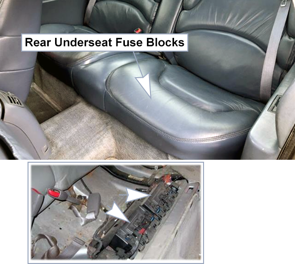 Two fuse boxes located under the rear seat. To access the fuse boxes, the rear seat cushion must be removed (pull up on the front of the cushion to release the front hooks, pull the cushion up and out toward the front of the vehicle).