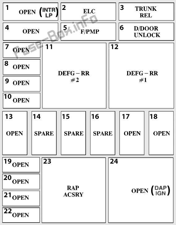 No. Description 1 1994-1995: Interior Lamps Relay;1996-1999: Open2 Electronic Level Control 3 Trunk Release Relay 4 Open 5 Fuel Pump Relay 6 Driver Door Unlock Relay 7-10 Open 11 Rear Defogger Relay (Upper Zone) 12 Rear Defogger Relay (Lower Zone) 13 Open 14-16 Spare 17-22 Open 23 Direct Accessory Power – Accessory 24 1994-1995: Direct Accessory Power – Ignition;1996-1999: Open