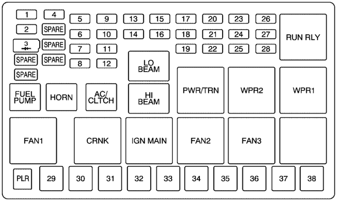 Short-Code Description RUN RLY Starter LO BEAM Low-Beam FUEL PUMP Fuel Pump HORN Horn AC/CLTCH Air Conditioning Clutch HI BEAM High-Beam PWR/TRN Powertrain WPR2 Wiper 2 WPR1 Wiper 1 FAN 1 Fan 1 CRNK Crank IGN MAIN Ignition Main FAN2 Fan 2 FAN3 Fan 3 BLANK Not Used