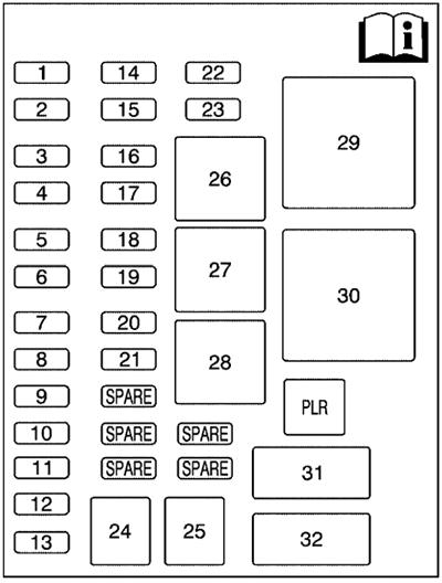 No. Description 1 Trunk, Door Locks 2 Electronic Level Control 3 Rear Wiper 4 Radio, DVD Player 5 Interior Lamps 6 OnStar 7 Keyless Entry Module 8 Cluster, Heating, Ventilation, Air Conditioning 9 Cruise Switch 10 Steering Wheel Illumination 11 Power Mirror 12 Stoplamp, Turn Lamps 13 Heated Seats 14 Blank 15 Electronic Level Control 16 Heated Mirror 17 Center High-Mounted Stoplamp, Back-up Lamps 18 Blank 19 Canister Vent Solenoid 20 Park Lamps 21 Power Sliding Door 22 Blank 23 Blank 24 Left Power Sliding Door 25 Right Power Sliding Door PLR Fuse Puller