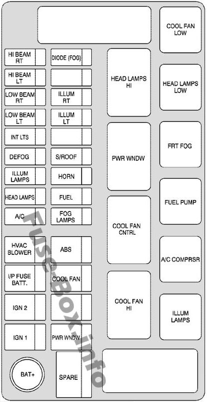 Short-Code Description H/L HI RH Head Lamp High Right Side BLANK Not Used H/L HI LH Head Lamp High Left Side BLANK Not Used H/L LOW RH Head Lamp Low Right Side ILL RH Parking Lamp Right Side, Illumination Circuit H/L LOW LH Head Lamp Low Left Side ILL LH Parking Lamp Left Side, License Plate Lamp ROOM LAMP Room Lamp BLANK Not Used DEFOG Defogger SUN ROOF Sunroof ILL LAMP Illumination Relay HORN Horn HEAD LAMP Headlamp FUEL PUMP Fuel Pump A/C COMP Air Conditioning Compressor FRT FOG Front Fog Lamp BLOWER Blower ABS Antilock Brake System IP F/BOX Instrument Panel Fuse Box RAD FAN Radiator Fan IGN 2 Ignition 2 IGN 1 Ignition 1 POWER WINDOW Power Windows FUSE SPARE Spare Fuse