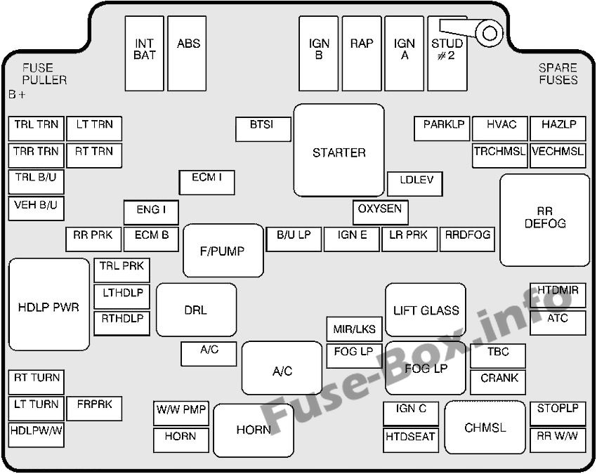 | 20A | 1 | Stoplamps, Hazard Lamps, Chime, Center High-Mounted Stoplamp Relay, Center High-Mounted Stoplamp |