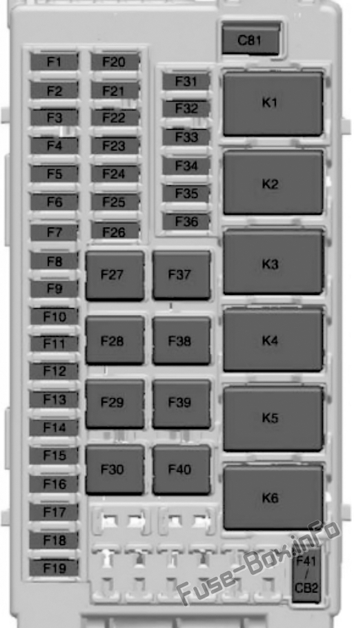 No. Description F01 LUMBAR F02 SUNROOF F03 VBAT 3 F04 VBAT 7 F05 VBAT 6 F06 AUTO HVAC F07 CGM F08 ST WHL HTR F09 DISPLAY F10 RADIO F11 ONSTAR F12 PARK ASSIST F13 MAN. HVAC F14 WL CHARGER F15 VBAT 2 F16 VBAT 1 F17 SWC BKLT F18 – F19 – F20 CLOCK SPRING F21 OCC SEN F22 DLC F23 SDM F24 IGN SW/ESCL F25 PWR L-GATE MDL F26 SEC FUSE-2 F27 PWR SEAT CO-DR F28 VBAT 8 F29 DC-DC F30 PWR L-GATE MDL F31 OSRVM F32 FRT HS PWR-1 F33 VBAT 4 F34 FRT HS PWR-2 F35 AMPLIFIER F36 SEC FUSE-1 F37 PWR SEAT DR F38 DC-DC 400W / DC-DC 200W F39 from 2022: SEC FUSE-1 F40 HVAC BLOWER