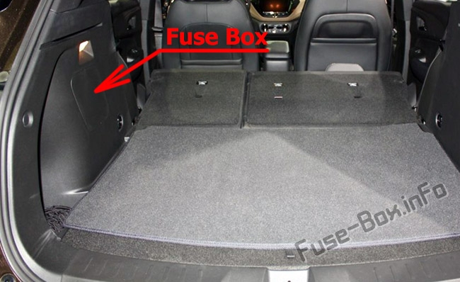 The rear compartment fuse block is behind a cover on the driver’s side of the luggage compartment.