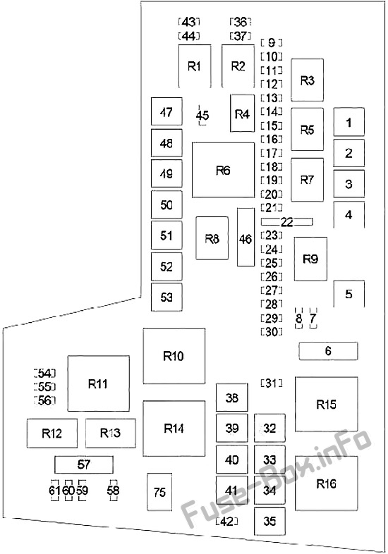 № Description R1 Right Trailer Tow R2 Left Trailer Tow R3 Air Conditioner Compressor Clutch R4 Horn R5 Transmission Control R6 Park Lamp R7 Fuel Pump R8 Fog Lamp R9 Not Used R10 Rear Window Defogger R11 Ignition – RUN R12 Wiper Motor High/Low R13 Wiper Motor On/Off R14 Starter R15 Automatic Shut Down R16 Blower Motor 75 Ignition – ACC