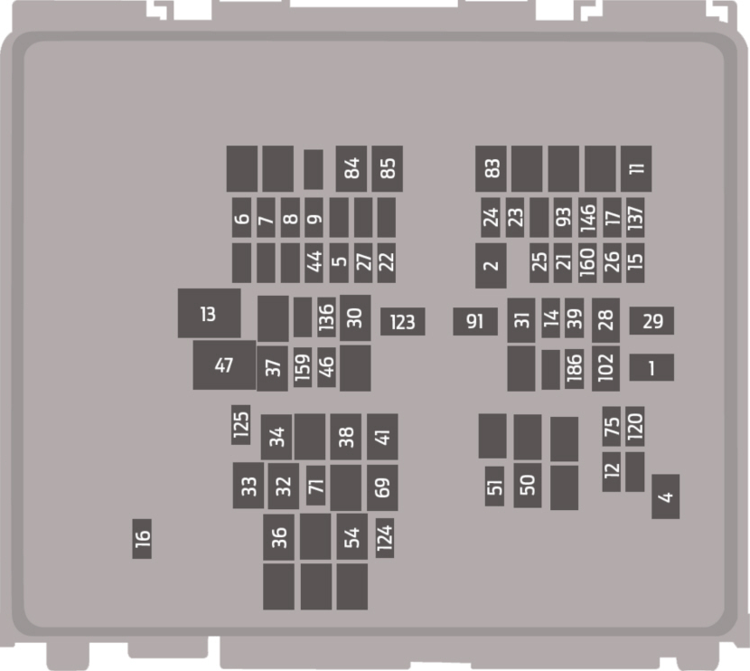 No. Amps Description 1 40A Body control module 2 30A Body control module 4 20A Fuel pump 5 5A Powertrain control module (hybrid) 6 – 9 15A Powertrain control module 11 30A Starter motor 12 10A Air conditioning clutch 13 40A Blower motor 14 20A Transmission oil temperature sensor 15 20A Horn 16 10A Rear window wiper, Rear window washer pump 17 5A Charge port (hybrid) 21 10A Headlamp leveling 22 5A Electronic power assist steering 23 10A Anti-lock brake system module 24 10A Powertrain control module 25 20A Front parking aid camera, Rear view camera, Blind spot information system, Adaptive cruise control 26 10A Powertrain control module (hybrid) 27 10A Electronic stability control (gas), Transmission oil pump (hybrid) 28 40A Anti-lock brake control valves 29 60A Anti-lock brake control pump 30 30A Driver power seat 31 30A Passenger power seat 32 20A Media bin power point 33 20A Rear console power point 34 20A Trunk power port 36 40A Power inverter 37 30A Glassroof 38 30A Climate control 39 20A Heated seats 41 30A Power liftgate 44 10A Brake on-off switch 46 10A Battery charge control module (hybrid) 47 60A Cooling fan 50 30A Rear window defroster 51 10A Heated exterior mirrors 54 40A Driveline control module 69 30A Windshield wiper motor 71 20A Rear window wiper, Rear window washer pump 75 5A Port fuel injectors (gas) 83 40A Supplemental heater (gas) 84 60A Supplemental heater (gas) 85 40A Supplemental heater (gas) 91 40A Trailer tow module 93 5A Adaptive cruise control 102 40A Auxiliary power distribution box (hybrid) 120 15A Port fuel injectors 123 50A Electric water pump (hybrid) 124 5A Rain sensor 125 5A USB smart charger 136 – 137 20A Amplifier 146 5A Battery electronic control module (hybrid) 159 5A DC/DC converter (hybrid) 160 15A Heated steering wheel 186 10A Data link connector