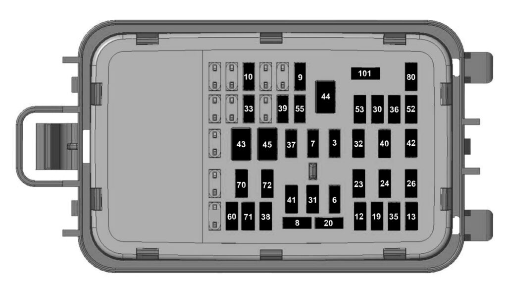 No. Amps Description 3 7.5 A Wireless charger 6 10 A Driver power window switch 7 10 A Gear shift module 8 7.5 A Cell phone passport module 9 5 A Overhead console combined sensing module 10 25 A Multi-contour seat module 12 5 A Climate control 13 7.5 A Steering column control module 19 5 A Head up display 20 5 A Ignition switch 23 30 A Driver door control module 24 30 A Sunroof 26 30 A Passenger door control module 30 10 A USB charging port 1 31 10 A Terrain management switch 32 20 A Audio control module 33 5 A Instrument cluster display 35 5 A Electronic toll collection 36 5 A 2024: Interior temperature sensor2025-2026: Air particulate matter sensor / Electronic toll collection37 15 A Adjustable pedals 38 5 A Spare 39 5 A Driver monitor 40 30 A Amplifier 41 10 A Navigation 42 15 A Voice control module 43 30 A Tailgate 44 40 A Driver seat 45 30 A Passenger seat 52 5 A Trailer brake switch 53 5 A 2024: Climate controlled rear seats2025-2026: Rear seat module – run feed55 5 A Electrochromatic rear view mirror 60 10 A Rear sliding window / sunroof / Driver power window 61 30 A Rear power window switch 70 20 A Advanced driver assistance systems 71 5 A High mounted camera 72 15 A Towing trailer connector 80 15 A Steering column control module / Heated steering wheel 101 10 A USB charge port 3