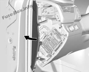 The left instrument panel fuse block access door is on the driver side edge of the instrument panel.
