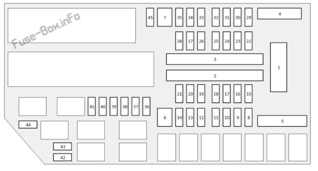 № Circuit Protected Amp 1 Battery 150 A 2 — (70 A) 2 EPS 70 A 2 — (30 A) 2 Fuse Box Main 2 60 A 2 Electric Servo Brake 40 A 2 ABS/VSA FSR 40 A 2 SBW 1 30 A 2 IG Main 1 30 A 3 Rear Defogger 40 A 3 Fuse Box Main 1 60 A 3 — (30 A) 3 Heater Motor 40 A 3 — (40 A) 3 — (30 A) 3 — (30 A) 3 — (30 A) 4 — (30 A) 4 Fuse Box Option 2 (70 A) 4 — (40 A) 4 Fuse Box Option 1 60 A 5 RFC 40 A 5 — (30 A) 5 SRM2 30 A 5 ABS/VSA Motor 40 A 5 IG Main 2 30 A 5 ENG EWP 30 A 6 SRM1 30 A 7 — — 8 Wiper Motor 30 A 9 Brake Light 10 A 10 EVTC 20 A 11 PCU EWP 15 A 12 RFC Coil 10 A 13 IGP 15 A 14 IG Hold 10 A 15 FI ECU 10 A 16 Battery Sensor 7.5 A 17 DBW 15 A 18 Ignition Coil 15 A 19 Hazard 15 A 20 — — 21 P-ACT ECU 7.5 A 22 Heated Steering Wheel (10 A) 23 — — 24 Audio 15 A 25 Rear Seat Heaters (20 A) 26 Heated Windshield (15 A) 27 Back Up 10 A 28 Horn 10 A 29 Front Fog Lights (10 A) 30 A/C EWP (10 A) 31 — — 32 Washer Motor 15 A 33 — — 34 — (10 A) 35 Audio Sub (7.5 A) 36 IGPS (LAF) 7.5 A 37 IG1 E-PARKING 7.5 A 38 IG1 IPU 10 A 39 IG1 TCU 10 A 40 IG1 Fuel Pump 20 A 41 IG1 ABS/VSA 7.5 A 42 IG1 ACG 10 A 43 IG1 RFC 7.5 A 44 IG1 Monitor 7.5 A