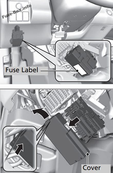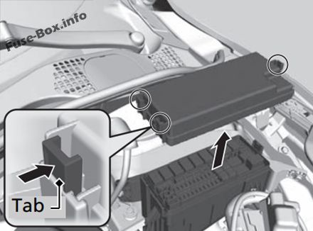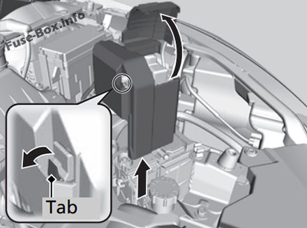 Push the tabs to open the box. Fuse locations are shown on the fuse box cover.