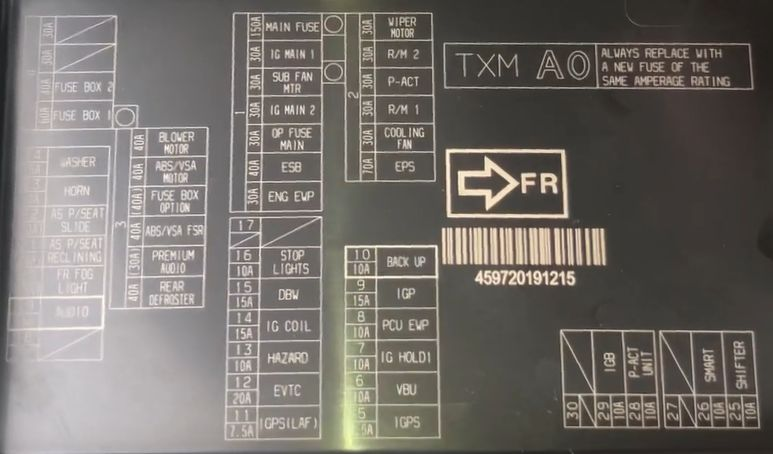 The primary under-hood fuse box (Fuse Box A) is located near the washer fluid (fuse locations are shown on the fuse box cover).