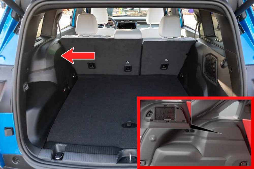 The rear fuse box is located in the trunk area, hidden behind a removable plastic panel on the driver’s side wall.