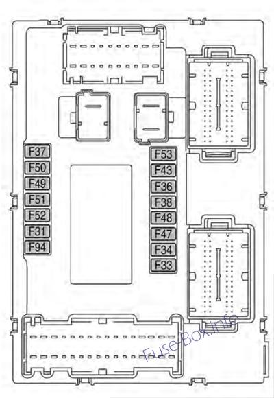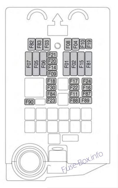 № Maxi Fuse Cartridge Fuse Micro Fuse Description F01 70A Tan – – Module Body Computer F02 70A Tan – – Module Body Computer, Rear Distribution Unit F03 – 20A Blue – Controller Power Supply Body Computer F04 – 30A Pink – Brake Control Electronics Module F05 70A Tan – – Electric Power-Assisted Steering F06 70A Tan / 20A Yellow – – Engine Cooling Fan F07 50A Red – – Engine Cooling Fan (2.4L) F08 – 30A Pink – Automatic Transmission, GSM F09 – – 5A Tan Control Module Engine F10 – – 15A Blue Horn F11 – – 5A Tan / 25A Clear Supply Secondary Loads F14 – – 15A Blue WCAC Pump/Active Grille Shutters F15 40A Orange – – Brake Control Module Pump F16 – – 5A Tan Engine Control Module Power, Automatic Transmission F17 – – 30A Green / 15A Blue Supply Primary Loads F18 – – 5A Tan Intelligent Battery Sensor (IBS) F19 – – 7.5A Brown Air Conditioner 1.3L Compressor F20 – – 5A Tan Electronic Power Four-Wheel Drive F21 – – 15A Blue Fuel Pump F22 – – 10A Red / 20A Yellow Power Control Module Engine F23 – – 30A Green Heated Windshield F24 – – 15A Blue Electronic Unit Supply Automatic Transmission F82 – 20A Yellow – Power Control Module Engine F83 – 40A Green – Air Conditioning Fan F84 – – 30A Green Power Supply All Wheel Drive F87 – – 5A Tan Gear Selector Automatic Transmission F88 – – 7.5A Brown Heated Outside Mirrors F89 – 30A Green – Heated Rear Window F90 – – 5A Tan Intelligent Battery Sensor (IBS) 1.3L