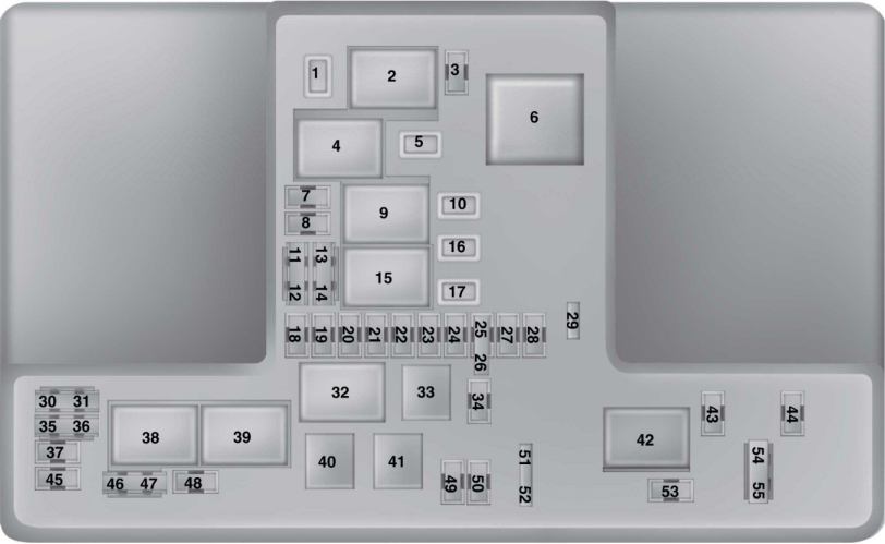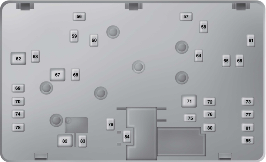No. Type Amps Description 56 M Case 30 A Fuel pump feed 57 N/A N/A N/A 58 N/A N/A N/A 59 J Case 40 A Vacuum pump relay 60 M Case 40 A Pulse width modulated fan 61 N/A N/A N/A 62 J Case 50 A Body control module 1 63 N/A N/A N/A 64 N/A N/A N/A 65 M Case 20 A Front heated seat 66 J Case 15 A Not used (spare) 67 J Case 50 A Body control module 2 68 M Case 40 A Heated rear window 69 M Case 30 A Anti-lock brake system valves 70 M Case 30 A Passenger seat 71 M Case 50 A Not used (spare) 72 M Case 30 A Moonroof / Panoramic roof #1 73 J Case 20 A 2017: Rear climate controlled seats2018-2020: Not used (spare)74 M Case 30 A Driver seat module 75 N/A N/A N/A 76 M Case 20 A e-Shifter 77 M Case 30 A Front climate controlled seats 78 N/A N/A N/A 79 J Case 40 A Blower motor 80 M Case 30 A Power decklid 81 M Case 40 A Inverter 82 J Case 60 A Anti-lock brake system pump 83 M Case 25 A Wiper motor #1 84 N/A N/A N/A 85 M Case 30 A Panoramic roof #2