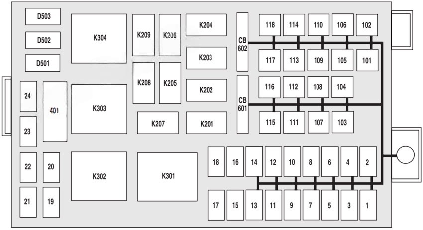 No. Amps/Type Description CB601 20A / Circuit Breaker Power seats CB602 20A / Circuit Breaker Delayed accessory relay for windows, moonroof, audio and navigation system