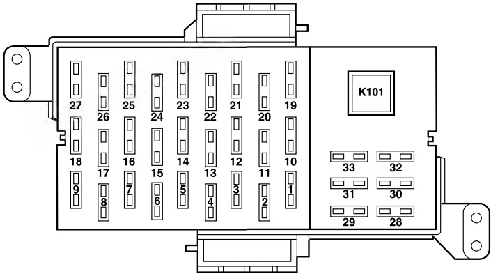 No. Type Description K201 1/2 ISO Horn K202 1/2 ISO PCM K203 1/2 ISO Fuel pump K204 1/2 ISO A/C clutch K205 — Not used K206 1/2 ISO Cornering lamp ground K207 1/2 ISO Fog lamps K208 1/2 ISO Park lamp isolation K209 1/2 ISO ABS relay K301 Full ISO Blower motor K302 Full ISO Starter solenoid K303 Full ISO Heated backlight K304 Full ISO RASM