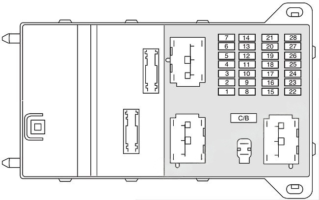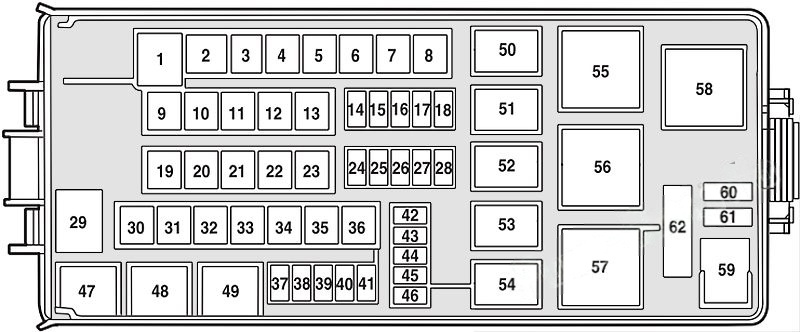 No. Type Description 47 1/2 ISO Relay Fog lamps 48 1/2 ISO Relay LH HID Low beam 49 1/2 ISO Relay RH HID Low beam 50 1/2 ISO Relay Wiper Park 51 1/2 ISO Relay A/C Clutch 52 N/A N/A 53 1/2 ISO Relay Wiper RUN 54 N/A N/A 55 Full ISO Relay Fuel pump 56 Full ISO Relay Blower motor 57 Full ISO Relay PCM 58 N/A N/A 59 N/A N/A 60 Diode Fuel pump 61 N/A N/A 62 Circuit Breaker Spare