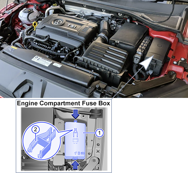 - Press the retaining tabs upward in the direction of the arrow and, at the same time, open the storage compartment further and remove it until the fuse panel is accessible.