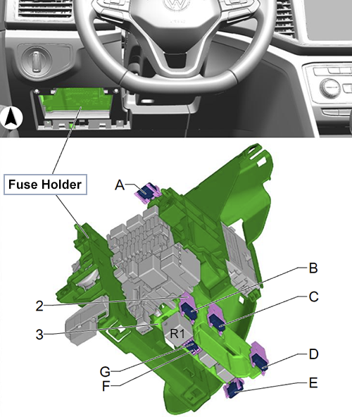| SC8 | 7.5A | up to Dec 2019: Diagnostic Connection, Electromechanical Parking Brake Button, Driving Profile Selection Control Head, Rain/Light Recognition Sensor, Rotary Light Switch, Cornering Lamp and Headlamp Range Control Module, Instrument Panel Contour Illumination Lamps 1-3, Garage Door Opener Control Head from Jan 2020: Diagnostic Connection, Electromechanical Parking Brake Button, Driving Profile Selection Control Head, Rain/Light Recognition Sensor, Rotary Light Switch, Cornering Lamp and Headlamp Range Control Module, Instrument Panel Contour Illumination Lamps 1-3, Garage Door Opener Control Head, Anti-Theft Alarm System Sensor |