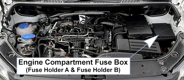 | 15 | 5A / 10A / 15A | 5A: Low/High heat output relays (diesel), Fuel pump relay, Electric fuel pump 2 relay, Automatic glow period control unit 10A: Lambda probe heaters, Low/High heat output relays, Fuel pump switch-off relay (engine code BSX), Gas injection valves 1-4 (engine code BSX) 15A: High-pressure valve for gas mode (engine code CHGA), Valve for gas tank (engine code CHGA), Sensor for gas level gauge (engine code CHGA), Gas injection valves 1-4 (engine code CHGA) |