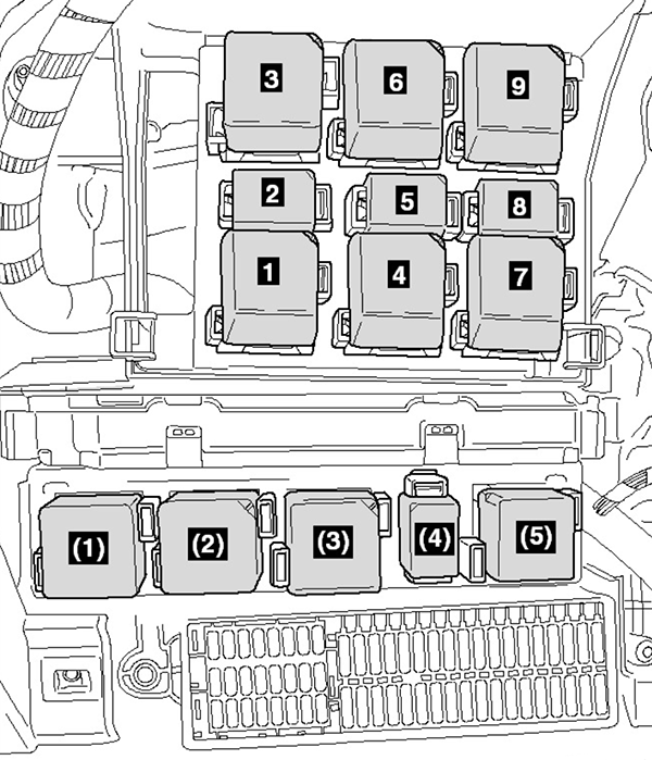 | (5) | up to Oct 2011: Starter relay 2 (507) from Nov 2011: Flashing lights relay (645), Trailer voltage supply relay (646, LHD vehicles from May 2012) |