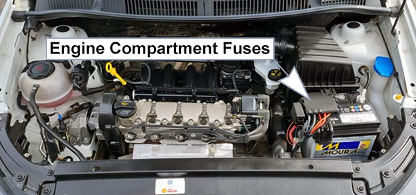 | SB34 | 10A | Hall sender -G40- (Only for vehicles with 1.2L and 1.4L Petrol engines) Intake manifold flap motor -V157- (Only for vehicles with 1.4L Diesel engine) Exhaust gas recirculation valve -N18- (Only for vehicles with 1.4L Diesel engine) Charge pressure control solenoid valve -N75- (Only for vehicles with 1.4L Diesel engine) Activated charcoal filter solenoid valve 1 -N80- (Only for vehicles with 1.2L and 1.4L Petrol engines) |