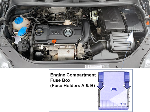 | SB23 | 5A / 10A / 15A – | Standard: Wastegate bypass regulator valve, EVAP canister purge regulator valve 1 (up to Oct 2009), Turbocharger recirculation valve, Secondary air injection solenoid valve, Leak detection pump, Fuel pressure regulator valve, Secondary air pump relay, Engine component power supply relay, Coolant circulation pump relay, Auxiliary coolant pump relay Golf Blue-E-Motion: Not Assigned |