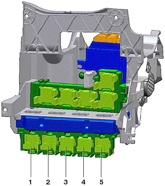 | 1 1/1 1/2 | up to Oct 2011: Starter relay 2 (with stop/start) [slot 1], Fuel pump relay 2 [slot 1/1], Coolant circulation pump relay [slot 1/2] from Nov 2011: Coolant circulation pump relay (2.0L gasoline), Terminal 50 power supply relay, Starter relay 2 (with stop/start system), Fuel pump relay 2 [all in slot 1] |
