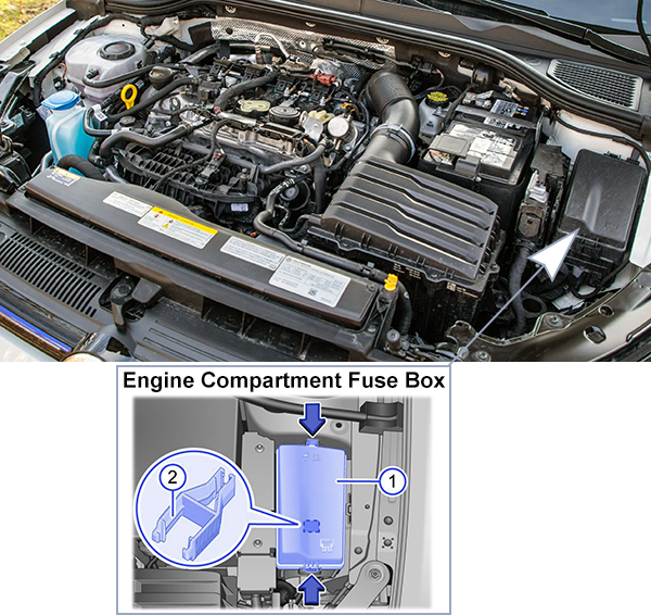 Press the catches in the direction of the arrow, to release the fuse box cover (1).
