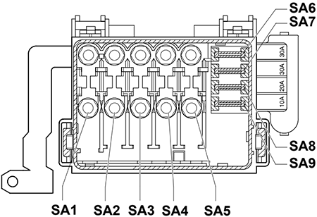 | SA9 | 10A 30A | May 1999 to Apr 2001: Radiator fan control unit (30A) FSI, GTI, 3L: Radiator fan control unit (10A) |