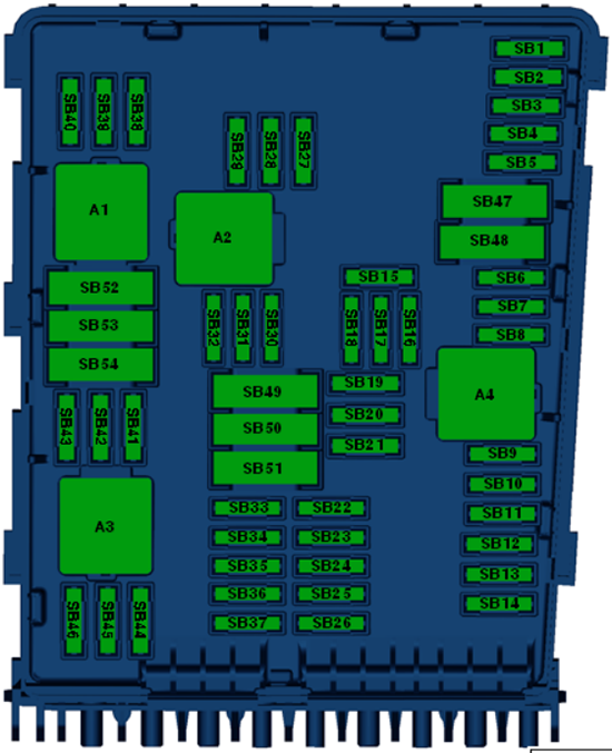 1 – Pre-Fuse box (Fuse holder A -SA-); 2 – Relay carrier under electronics box; 3 – Terminal 30 wiring junction; 4 – Heated windscreen relay; In plenum chamber next to engine control unit; 5 – Fuses on left under dash panel; 6 – Fuse holder on the right side edge of the instrument panel (Fuse holder D -SD-); 7 – Relays on onboard supply control unit; 8 – Fuses in the luggage compartment (Fuse holder F -SF-); There are additional fuses above the vehicle battery behind the panel on the left side of the luggage Compartment. 9 – Fuse 2 (30) -S205- (60 A); 10 – Fuse holder on the left side edge of the instrument panel (Fuse holder C -SC-); 11 – Relay carrier 1 on left under dash panel; 12 – Relay carrier 2 on left under dash panel; 13 – Relay carrier under electronics box; 14 – Fuse box in the Engine compartment (Fuse holder B -SB-)[/ads_col][/ads_row].
