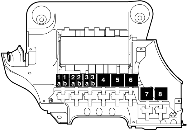 | SB12 | 15A | J519 – Vehicle Electrical System Control Module J567 – Left Headlight Range Control Module M29 – Left Low Beam Headlight J683 – Left HID Lamp High Beam Control Module M30 – Left High Beam Headlight |