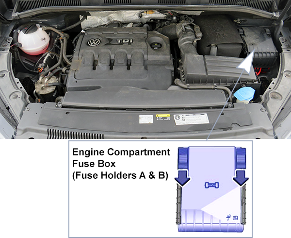 | 8 | From May 2010: Additional coolant pump relay -J496- (Only models with a petrol engine; From May 2012, on relay carrier in engine compartment under E-box) Dual tone horn relay -J4- (From May 2012, on relay carrier in engine compartment under E-box) |