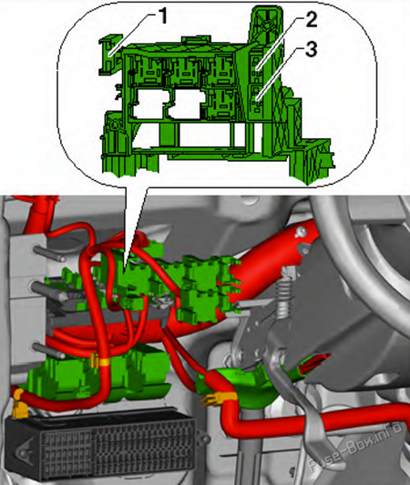 | F23 | 15A | 2010-2014: Charge pressure control solenoid valve Heater element for crankcase breather Automatic glow period control unit Exhaust gas recirculation cooler changeover valve Fuel metering valve Fuel pressure regulating valve Coolant circulation pump 2 Additional coolant pump relay Clutch position sender Brake light switch |