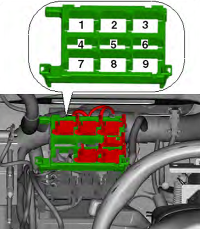 | 6 | Fresh air blower relay -J13- (Only models with auxiliary heater) |