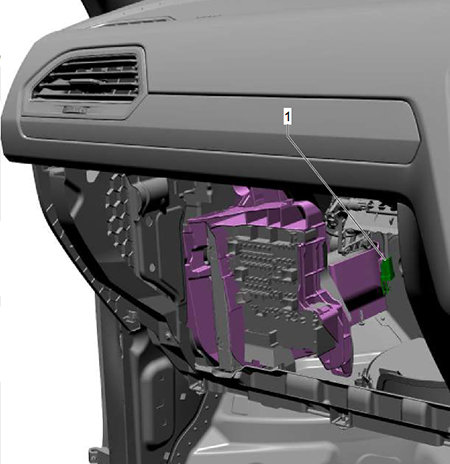 Push the retaining lugs (1) upwards in the direction of the arrow whilst opening the stowage compartment until the fuse carrier can be accessed.